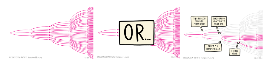 Figure 3: Break the Chain, Toby Morris and Dr Siouxsie Wiles, 2020. This visual aid, which was distributed as an animation, clearly communicates the concept of exponential transmission of SARS-CoV-2. This illustration was used in official health communications around the world and first published in The Spinoff in 2020. Available under the Creative Commons CC-BY-SA-4.0 licence [6].
